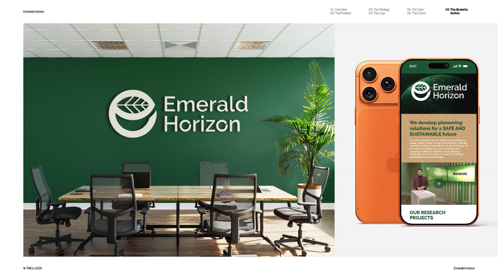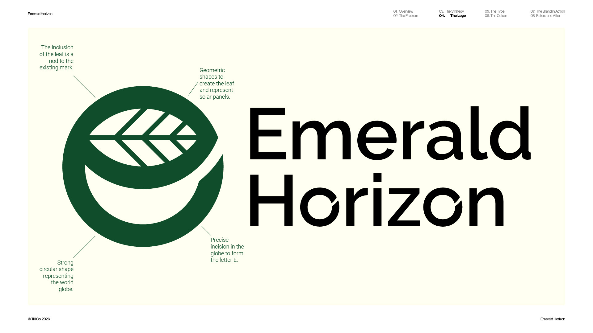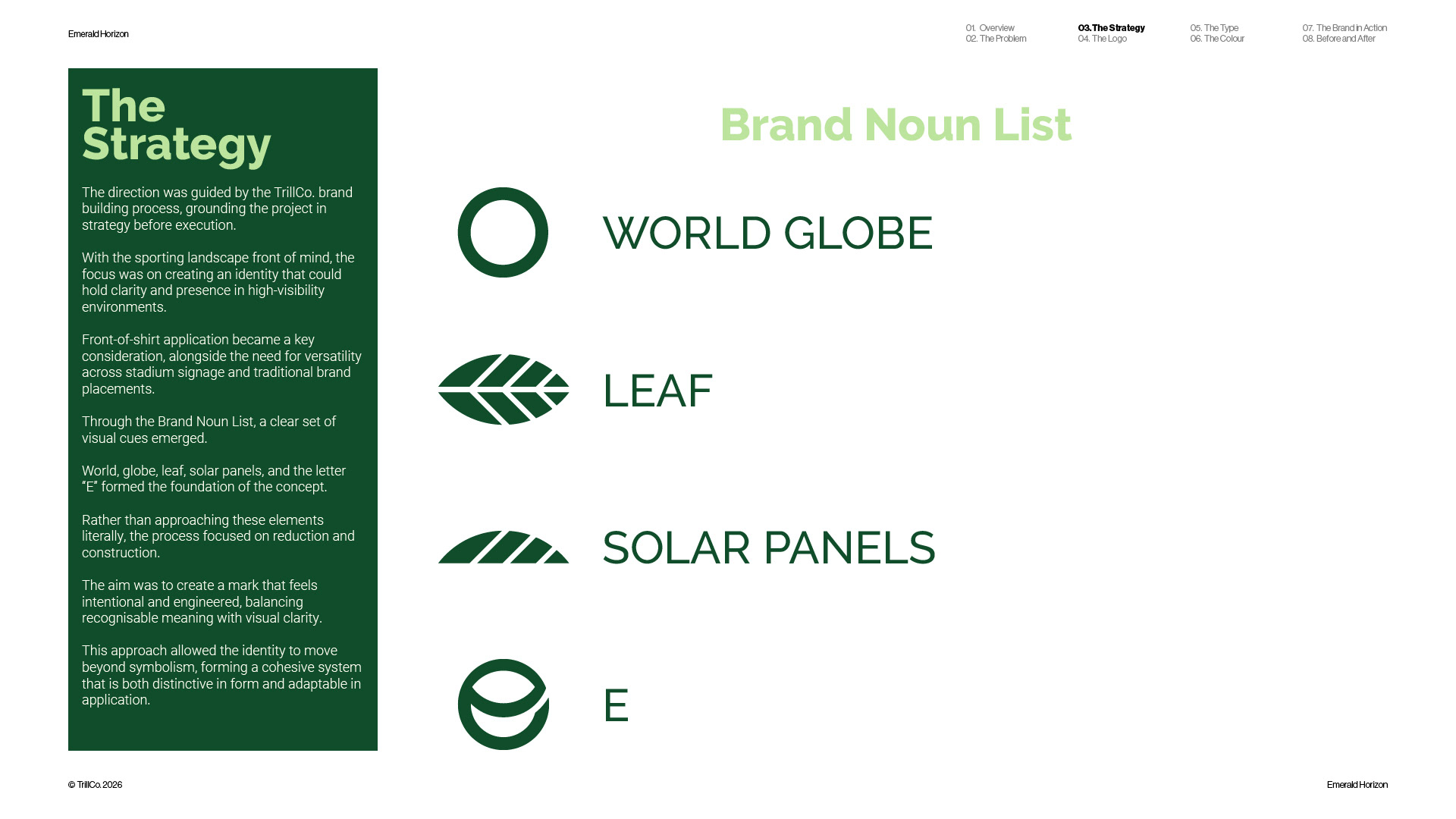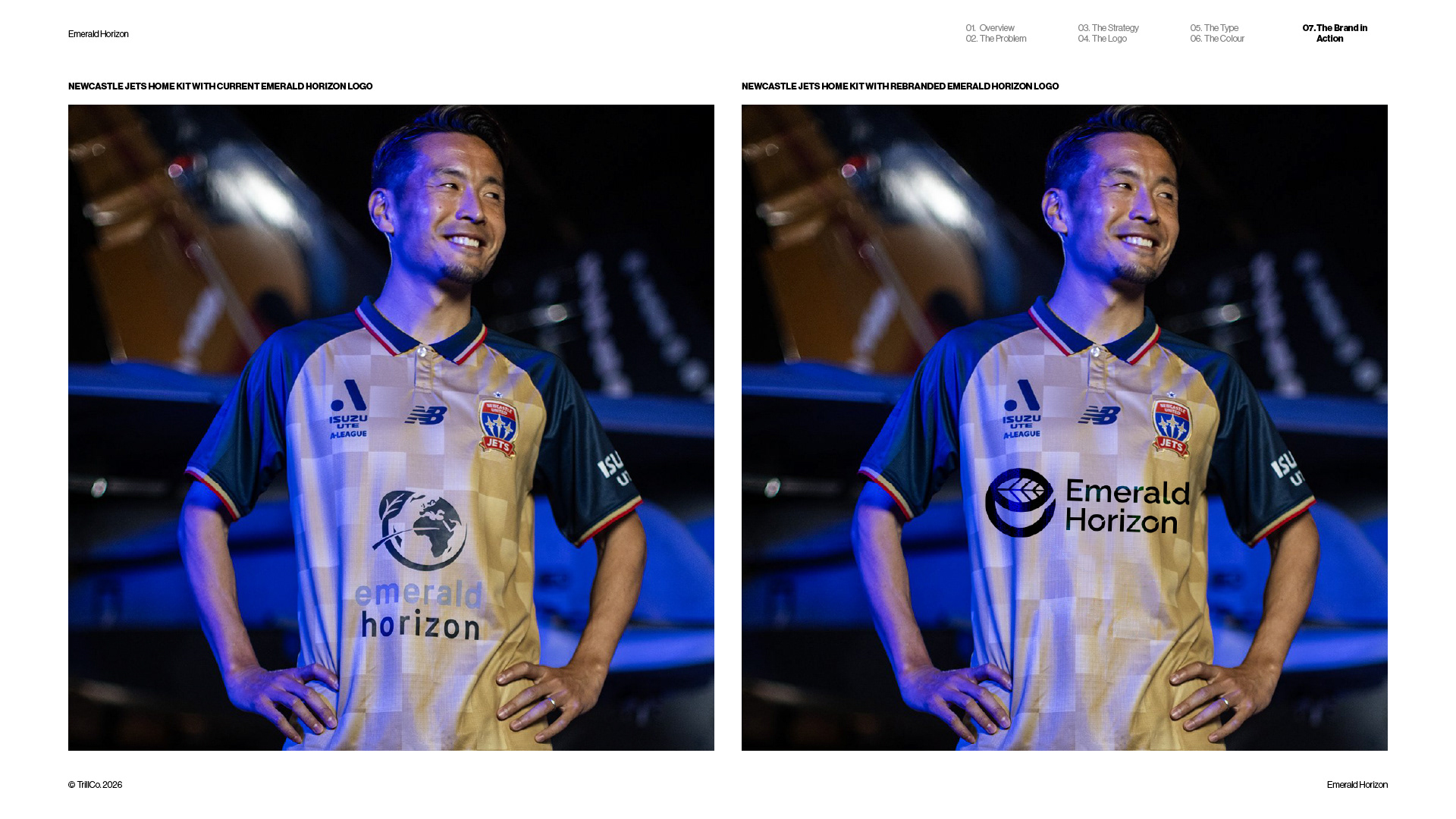 A strategic rebrand for Emerald Horizon, an energy company focused on sustainable solutions across solar, infrastructure, and long-term performance. The project was driven by real-world application, with the sporting environment playing a key role in shaping the direction. Guided by the TrillCo brand building process, the identity centres on clarity, structure, and recognisability at scale. Built from the ideas of globe, leaf, energy, and the letter E, the result is a refined, adaptable mark designed to perform across high-visibility environments, from front-of-shirt sponsorship to broader brand applications.